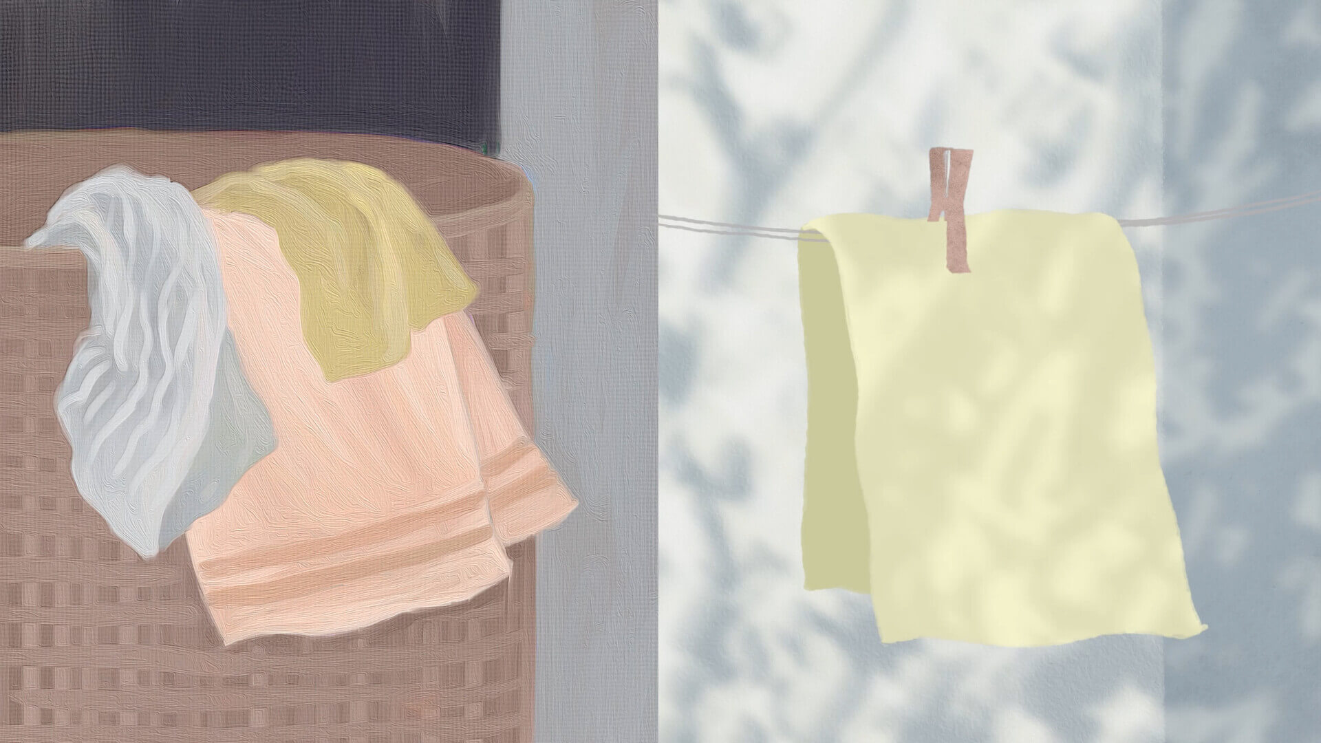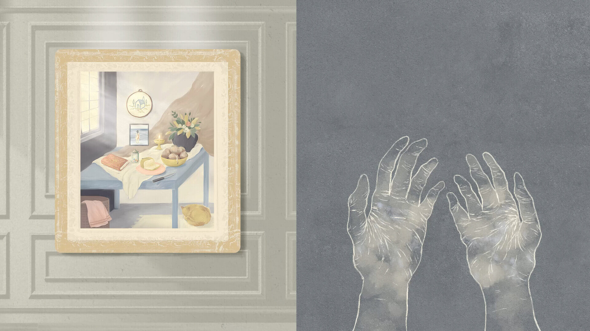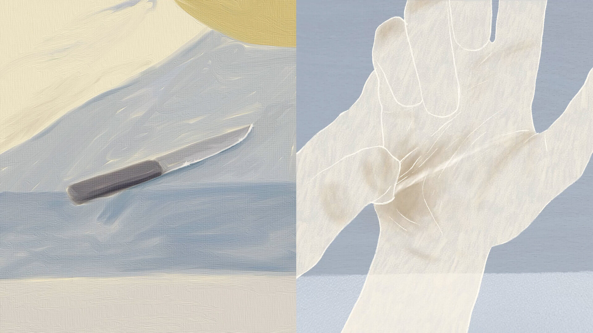 Not Specified 2025On a split screen two parallel and contrasting narratives unfold. The world of art and the realm of the everyday are integrally connected and yet hugely disparate. A pair of hands working relentlessly inside a home fade away; while a painting hanging quietly in a museum gains fame.